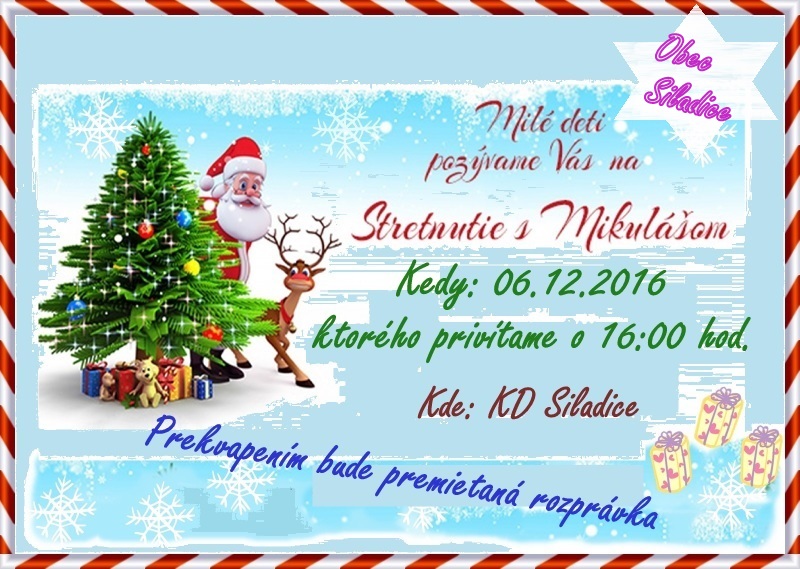 Obec Siladice usporiadala dňa 06.12.2016 o 16.00 hod. stretnutie s Mikulášom Prekvapením bola premietaná rozprávka